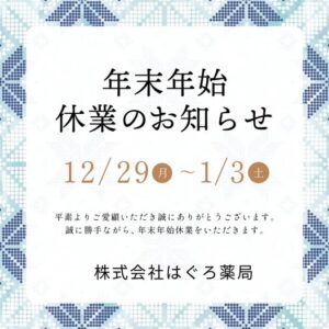 はぐろ薬局の各店舗は、12/29(月)~1/3(土)まで臨時休業とさせていただきます。緊急のご相談、調剤対応についてはお電話にてご連絡ください。なお、新年の営業は1/5(月)9:00からとなります。